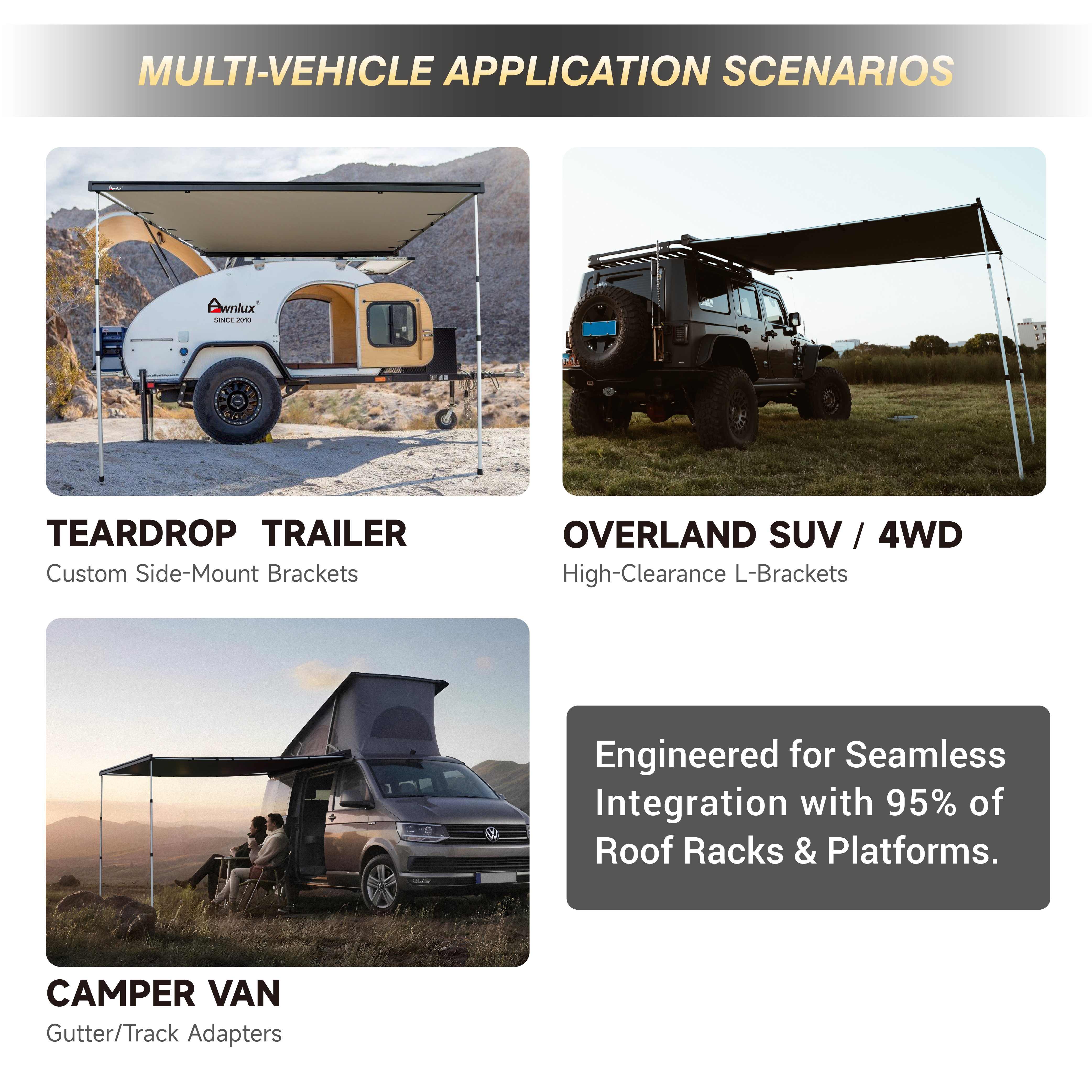 15年以上のアウンイング製造経験を持つAwnluxは、キャンピングバン、ティアドロップトレーラー、モーターホーム、キャブコン、 caravan(トレーラーハウス)など、RVおよびトレーラー用アウンイングのフルラインナップを提供しています。どのような車両をお持ちでも、旅にぴったりのAwnluxアウンイングがあります。
